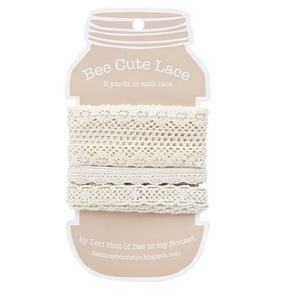 Add an extra charm to your projects with Lori Holt Bee Cute Lace. Includes two yards each of three different designs on a card. This assortment includes 1 5/8", 5/8", and 3/8" natural lace.